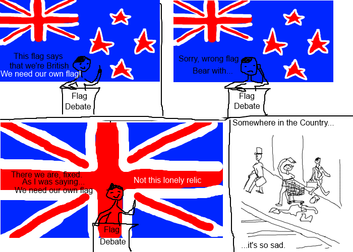 But, hey, there is a debate in some people's mind. There are two main contentions. Firstly, there's the idea that our flag is too similar to those of some other countries. Well, that's nonsensical: heaps of countries have visually similar flags and no-one cares. Besides, our flag is older (in design) than Australia's. Secondly, there's the more important contention that this badly drawn cartoon critiques.